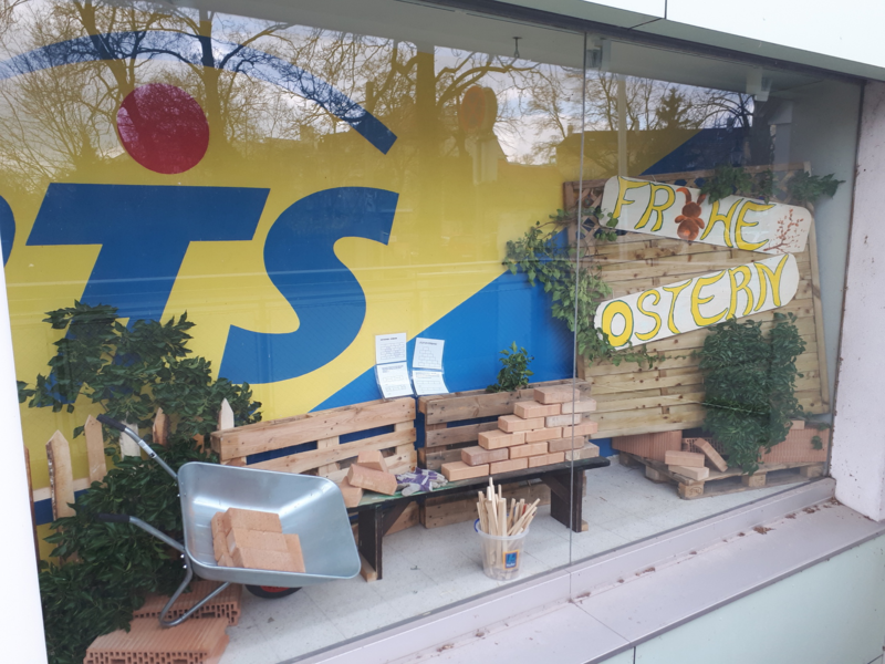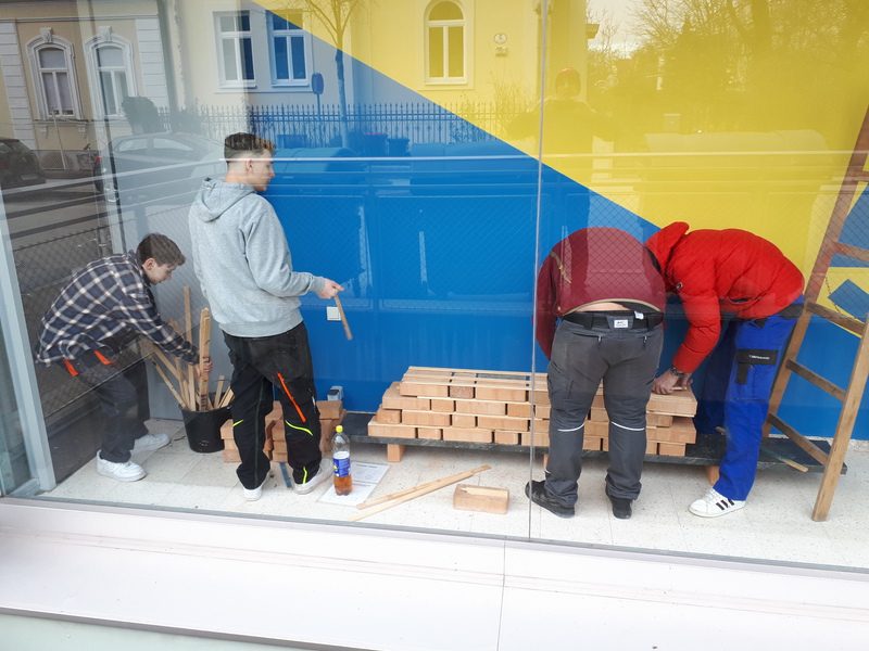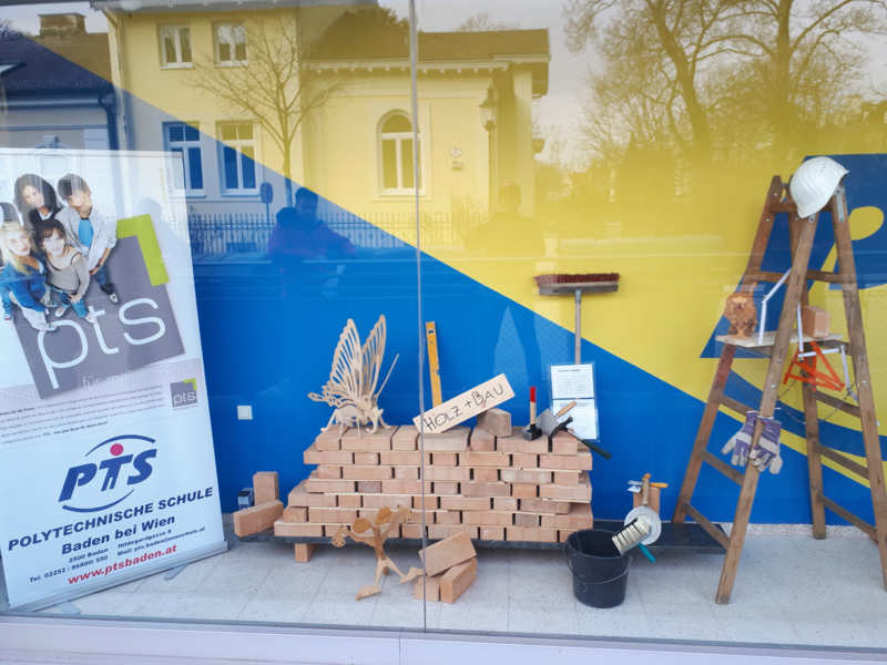 Gemeinsam mit dem Fachbereich Büro/Handel gestaltet der Fachbereich Holz/Bau unsere Auslage in der Hildegardgasse. Diese wird Firmen aus der Region für WErbezwecke kostenfrei zur Verfügung gestellt. Im fachpraktischen Unterricht werden gemeinsam Konzepte entwickelt, wie die Auslage - passend zum ausstellenden Betrieb - gestaltet werden kann. Unsere Schüler und Schülerinnen sind immer sehr fleißig und kreativ bei der Arbeit